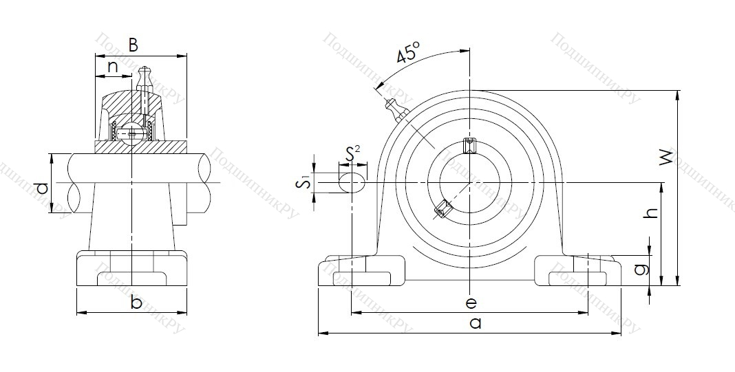 В конструкцию детали входит корпусный подшипник типа UC, установленный в корпус типа Р из чугуна с нишей сферической формы. Монтаж на вал осуществляется посредству кольца, оснащенного парой штифтов, закручиваемых шестигранником, что обеспечивает самовыравнивание.